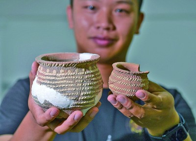 考古工作人員展示甘肅慶陽市南佐新石器時代遺址內出土的箍白泥附加堆紋夾砂陶罐。 新華社記者 李賀攝