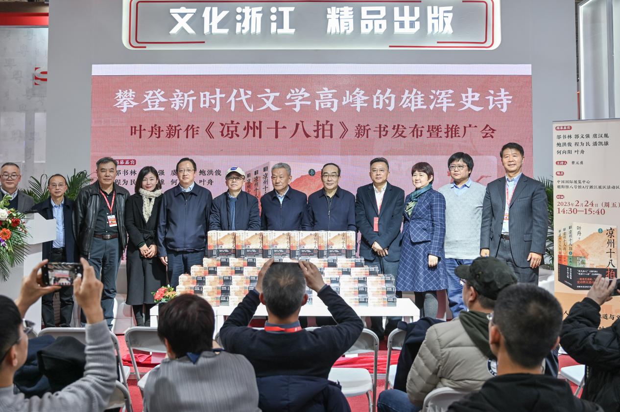 2月24日,由浙江出版聯(lián)合集團、浙江文藝出版社主辦的“攀登新時代文學高峰的雄渾史詩——葉舟新作《涼州十八拍》新書發(fā)布暨推廣會”在中國國際展覽中心舉辦。中國出版協(xié)會理事長鄔書林,中國出版協(xié)會副理事長、中國圖書評論學會會長郭義強,浙江省委宣傳部副部長虞漢胤,浙江出版聯(lián)合集團董事長、黨委書記鮑洪俊,浙江出版聯(lián)合集團董事、總經(jīng)理、總編輯程為民,中國作家協(xié)會小說委員會副主任潘凱雄,中國作家協(xié)會創(chuàng)研部主任何向陽,北京大學副教授叢治辰以及作者葉舟出席新書揭幕儀式。
