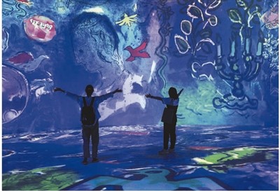 觀眾在安徽省美術(shù)館“馬克·夏加爾:物色之夢(mèng)數(shù)字藝術(shù)展”參觀。