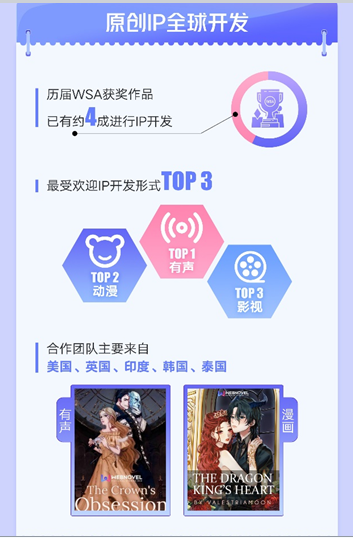 《報告》顯示,歷屆WSA獲獎作品已有約4成進行IP開發(fā),其中,WSA2020冠軍作品《沉淪愛的冠冕》已改編成有聲劇,WSA2021冠軍作品《情迷》已翻譯成韓語在當地上線,另有《龍王的不眠之夜》等多部優(yōu)秀作品被改編為漫畫。IP開發(fā)的合作團隊主要來自美國、英國、印度、韓國和泰國。