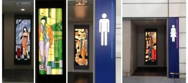 上海浦東機(jī)場(chǎng)衛(wèi)星廳中的衛(wèi)生間采用了彩色鑲嵌玻璃做壁畫標(biāo)識(shí)