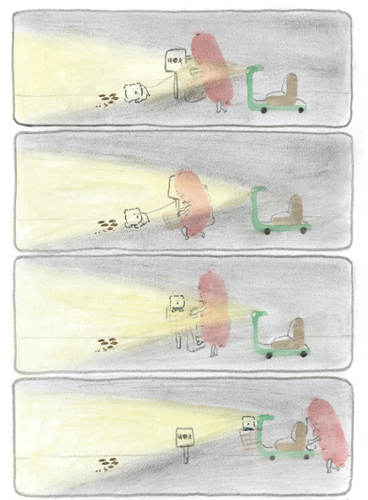 安寧達(dá)表示,自己在開始創(chuàng)作《香腸爺爺》的時(shí)候就將讀者定位為成年人。這部圖畫作品十分厚重,多達(dá)264頁,由662張圖片構(gòu)成,圖片多以分鏡呈現(xiàn)。除去復(fù)雜、精巧的畫面處理,她在創(chuàng)作時(shí)也傾注了自己對(duì)于人生悲喜的感悟。韓國劇作家“清涼的仲夏夜”讀完作品,直言這本書的表達(dá)讓人熱淚盈眶。韓國圖畫書評(píng)論家金智恩認(rèn)為《香腸爺爺》平靜地傳達(dá)了“愛始于最孤獨(dú)的地方”這一主題,像鈴鐺一樣緩緩響起,余音繞梁,令人長久深思,“預(yù)示了繪本敘事的新可能,是一部面向未來的作品”。