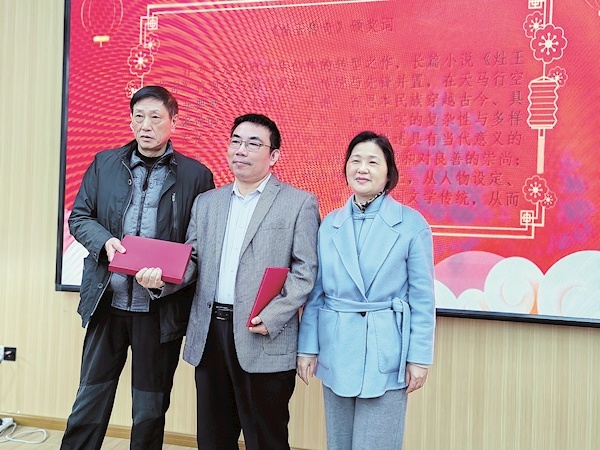 武漢市文聯(lián)黨組成員、副主席董芳(右一)與天津市作協(xié)副主席肖克凡(左一),共同為長篇小說《灶王傳奇》作者李浩頒獎(jiǎng) 通訊員供圖