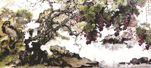 我向來(lái)認(rèn)為,寫作和繪畫原本應(yīng)該一體的,這才是文人畫的真諦,偏離哪一方面都是一種遺憾乃至缺失。歷代文人大抵也都能舞文弄墨,這大概就是文人畫的真正來(lái)由,國(guó)畫之說(shuō)乃后來(lái)的泛指。從我個(gè)人角度來(lái)說(shuō),也向來(lái)把寫作和繪畫當(dāng)成一回事。我把葡萄當(dāng)成繪畫主題,絕不是為畫而畫,我是懷著對(duì)葡萄原根情結(jié)的追問(wèn)和審美沖動(dòng)而產(chǎn)生繪畫沖動(dòng),而非只是題材的選擇。一邊以作家的視角總結(jié)出葡萄精神的三種境界和哲學(xué)思考;一邊以畫家的敏感,采用新水墨技法,將國(guó)畫的寫意與油畫的色彩結(jié)合起來(lái),使光影、線條、色彩呈現(xiàn)出更加新奇的視覺(jué)效果,創(chuàng)作出一系列獨(dú)具特色的葡萄國(guó)畫作品,壯寫西域風(fēng)情,絲路情懷,敦煌情調(diào),表達(dá)對(duì)新時(shí)代、新絲路的暢想與哲學(xué)思考。