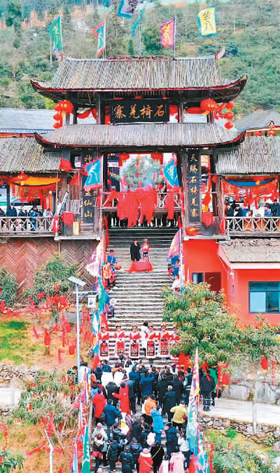 高聳的寨門,秀美的山道,鼓樂喧天,歡歌熱舞。