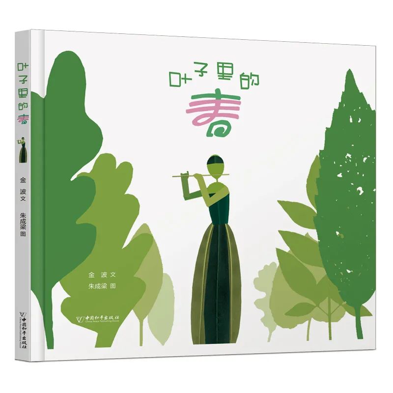 “笛聲悠揚呼喚立春,琵琶弦弦彈奏雨水,鼓聲陣陣大地驚蟄,提琴緩緩春分來臨……詩歌和畫面時而重合時而平行,讓作品產(chǎn)生了一種流動的音樂感。”《葉子里的春》由著名詩人、兒童文學(xué)作家金波和著名圖畫書作家、插畫家朱成梁共同創(chuàng)作,以葉子為素材,組合成眾多新的形象,講述了一個關(guān)于樹葉、音樂、節(jié)氣和春姑娘的故事。