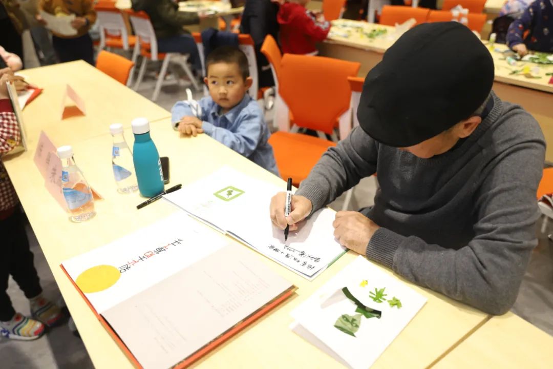 活動現(xiàn)場,有70組親子家庭參與到葉子畫的創(chuàng)作互動中,朱成梁老師為每一位小讀者簽名作畫,合影留念。