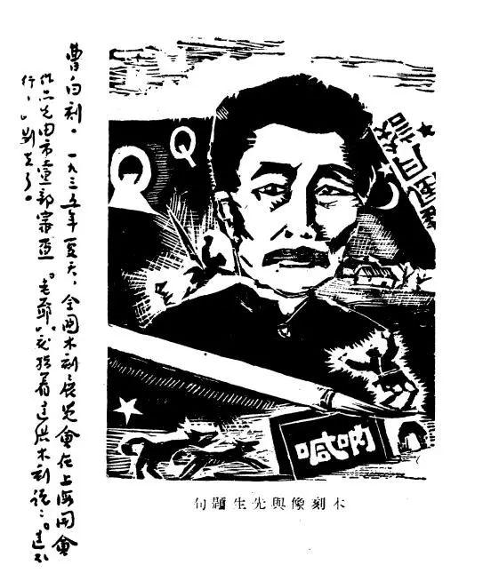 在紀(jì)念的同時,這些插圖也在塑造魯迅的形象[6],如彼得?伯克指出的,“人物肖像也是一種符號形態(tài)”[7]。1938年版的插圖建構(gòu)的是富有生活氣息、有血有肉的“人”的魯迅,是“生活者”魯迅,其時“革命斗士”的一面尚不明顯。文前41張插圖中,劍拔弩張的只有第五卷第二張“木刻像與先生題句”。木刻正中為嚴(yán)肅凝重的魯迅,四周環(huán)繞各種意象:左下角插入一支巨筆,既是作為戰(zhàn)斗的武器,構(gòu)圖上又是分割線;筆下墊著如碑文狀的《吶喊》,筆尖站立一人兩手揮舞,似乎是狂人形象,后面有兩條惡犬對之狂吠;左上角兩個變形的巨大的Q字,又延伸出閃電刺向阿Q樣的人物;右上角則為倒立的“準(zhǔn)風(fēng)月談”,再下則是月亮星星照耀下的山村。魯迅在木刻旁邊題辭:“曹白刻。一九三五年夏天,全國木刻展覽會在上海開會,作品先由市黨部審查。‘老爺’就指著這張木刻說:‘這不行。別掛了?!蹦究啼秩境鲷斞笐?zhàn)斗的場景,魯迅的題辭又揭示了國民黨的壓迫,互相呼應(yīng)。
