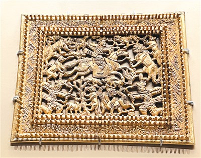來自寧夏回族自治區(qū)鹽池縣博物館的狩獵紋金方奇,雕刻十分精美,主體畫面表現(xiàn)狩獵場景,造型風(fēng)格與薩珊王朝金飾頗為相近。根據(jù)背面銘文可知,這是十六國時(shí)期南匈奴之遺物。