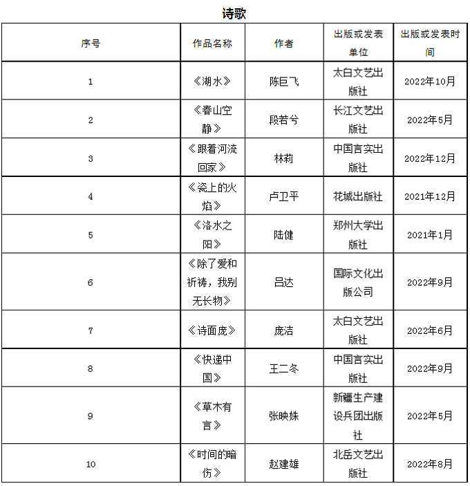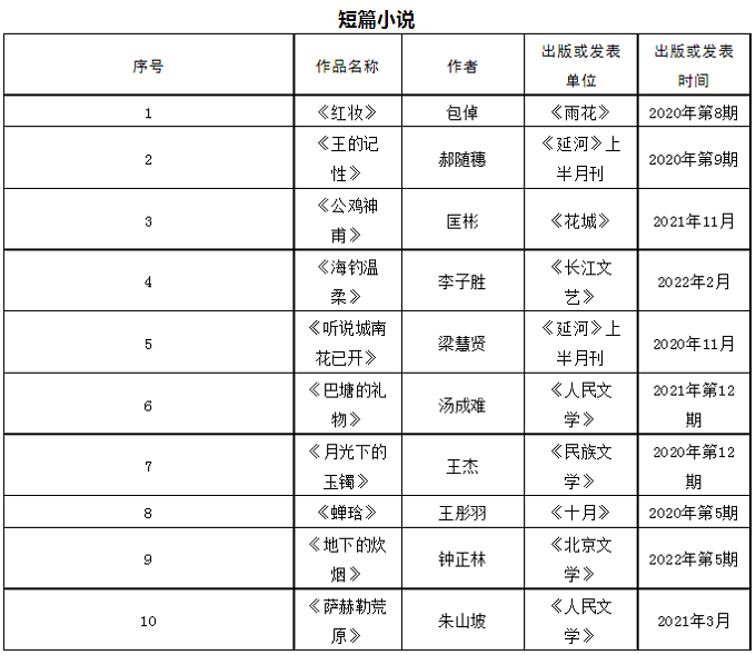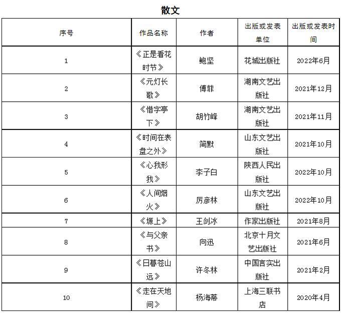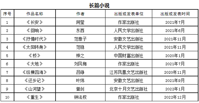 首屆石峁文學(xué)獎(jiǎng)初評(píng)委員會(huì)經(jīng)過(guò)認(rèn)真閱讀討論,于2023年4月17日投票表決產(chǎn)生50部(篇)初選作品?,F(xiàn)將初選作品名單在魯迅文學(xué)院微信公眾號(hào)和中國(guó)作家網(wǎng)(http://m.jpg-valve.com)公示。公示期截止于2023年4月21日,在此期間,如發(fā)現(xiàn)初選作品有不符合《首屆“石峁文學(xué)獎(jiǎng)”參評(píng)作品征集啟事》的情況,請(qǐng)向評(píng)獎(jiǎng)辦公室提出。