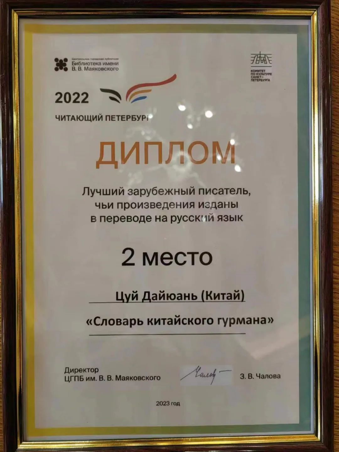 日前,由中國文字著作權(quán)協(xié)會代理輸出版權(quán),作家、文化學者、北京讀書形象大使崔岱遠的《吃貨辭典》圖書俄文版榮獲俄羅斯馬雅可夫斯基中央市立公共圖書館(Центральная городсткая публичная библиотека имени В.В. Маяковского)頒發(fā)的“閱讀彼得堡:最佳外國作家”二等獎(Читающий Петербург:выбираем лучшего зарубежного писателя)。