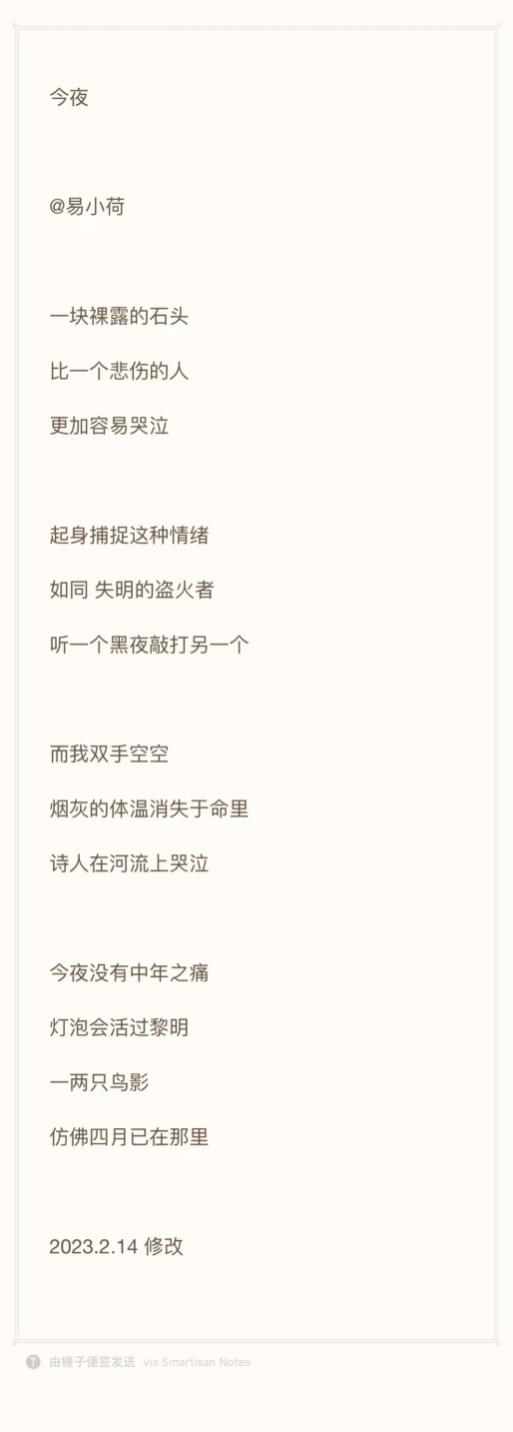 易小荷偶爾喜歡在朋友圈寫寫詩(shī),她將自己的詩(shī)歌稱為“抽屜文學(xué)”,從未發(fā)表過(guò)
