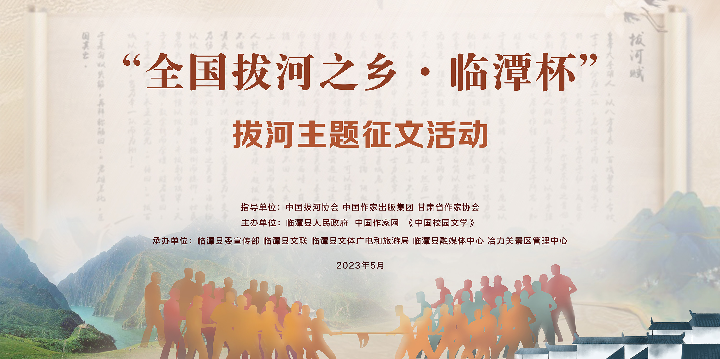 為深入貫徹落實(shí)黨的二十大精神,弘揚(yáng)全社會(huì)團(tuán)結(jié)奮斗的精神標(biāo)識(shí),挖掘、刻畫、弘揚(yáng)、傳播拔河運(yùn)動(dòng)承載的文化內(nèi)涵和精神力量,助力全國(guó)拔河之鄉(xiāng)·臨潭縣國(guó)家級(jí)非遺項(xiàng)目“萬(wàn)人扯繩(拔河)”文化品牌傳播,增強(qiáng)中華優(yōu)秀傳統(tǒng)文化自信,經(jīng)臨潭縣人民政府和中央定點(diǎn)幫扶單位中國(guó)作家協(xié)會(huì)商議,決定以文學(xué)的方式記述展示拔河這一群眾體育、民俗活動(dòng)的獨(dú)特魅力,以匯集到的優(yōu)秀文學(xué)作品豐富全國(guó)拔河文化發(fā)展成果,為脫貧縣新時(shí)代經(jīng)濟(jì)社會(huì)高質(zhì)量發(fā)展注入精神力量。值此今年7月2023“冶力關(guān)杯”中國(guó)拔河公開賽暨第七屆甘肅·臨潭拔河節(jié)(擬定名)即將舉辦之機(jī),為配合賽事品牌宣傳,進(jìn)一步挖掘弘揚(yáng)“一根繩,一條心,一股勁”的拔河精神,在中國(guó)拔河協(xié)會(huì)、中國(guó)作家出版集團(tuán)、甘肅省作家協(xié)會(huì)等單位指導(dǎo)協(xié)作下,特面向全國(guó)舉辦該主題征文活動(dòng)。