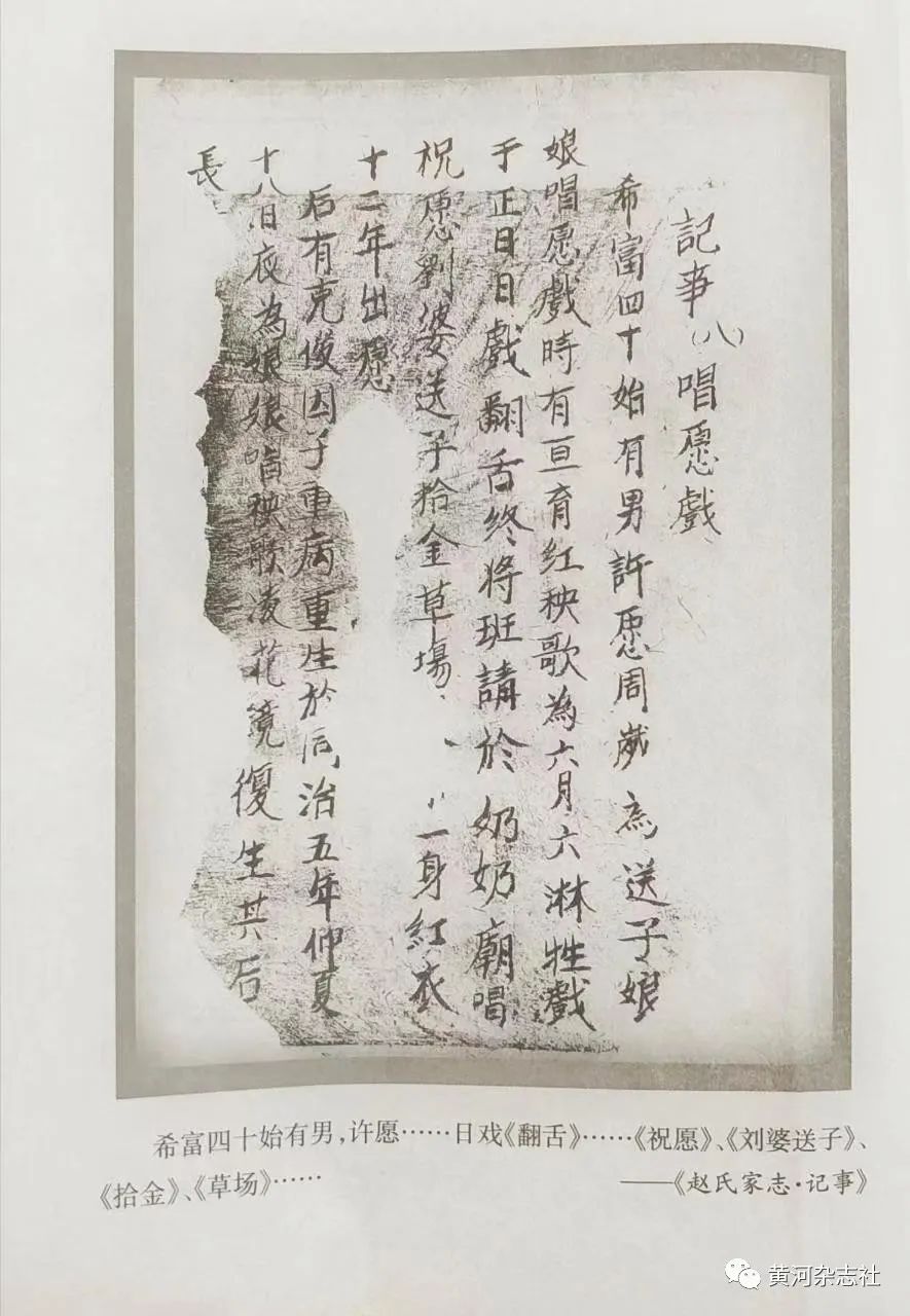 又據(jù)朔州馬邑《趙氏家志,記了篇第八:唱愿戲》載:雍正六年希富四十始有男,許愿周歲為送子娘娘唱愿戲,時,有秧歌戲為六月六日淋生戲,于正日日場巧女翻舌終,將戲班請于奶奶廟,唱“祝愿劉婆送子、拾金”,爾一身紅衣十二年。后有克俊因子重病重生,于同治五年仲夏十八日,為奶奶廟唱秧歌“對凌花、復(fù)生”,其后子長壽。