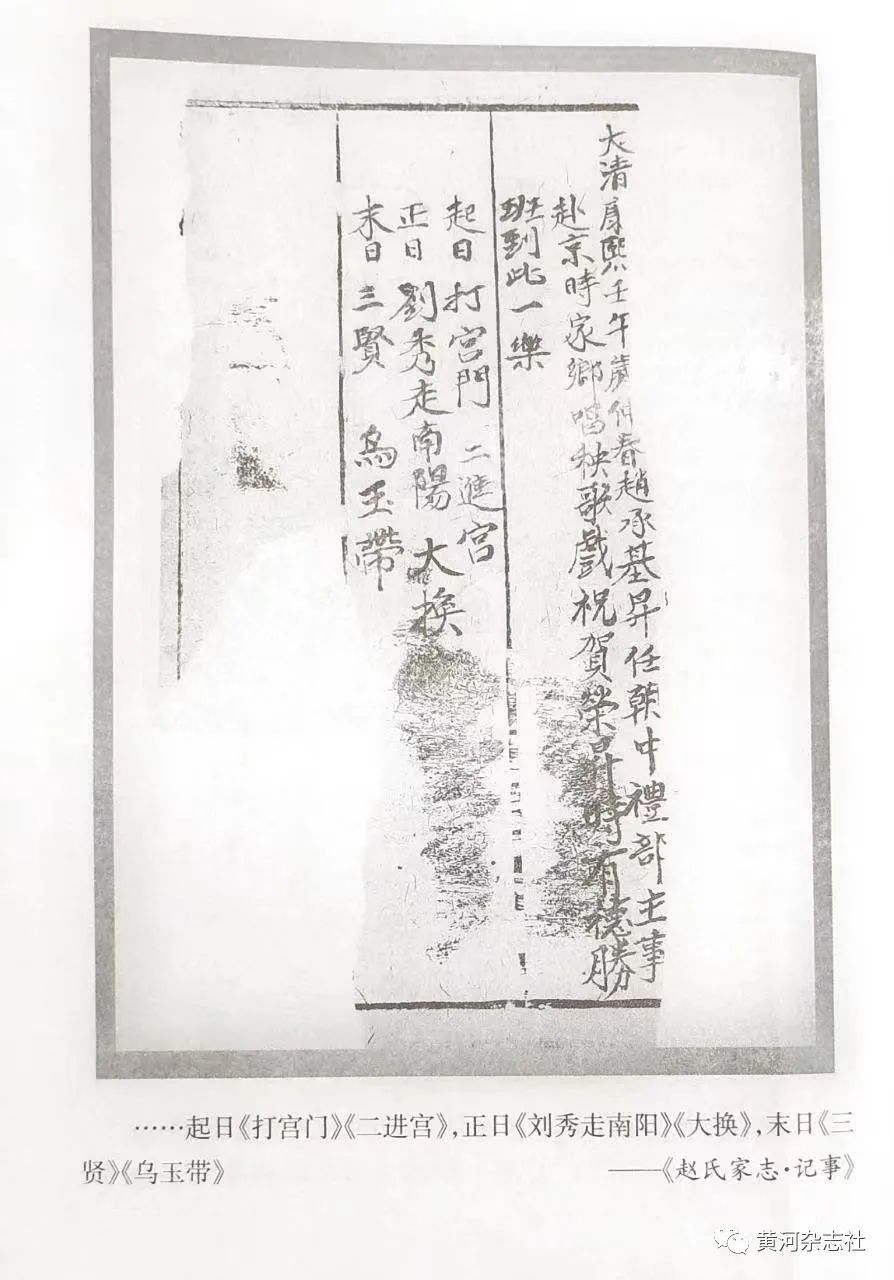 朔縣劉家窯舞臺題筆中寫道:雍正九年七月議合秧歌班到此一樂,唱《安安送米》《雙驢頭》《趕子》《教子》《吉子》《花亭》《列女傳》。有孔三旦、孔尚玉、梁余修、李元、德小、二濃帶。德小班頭。