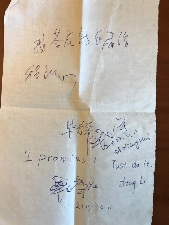 “當時喝到一半,很歡快?!背逃佬赂嬖V澎湃新聞記者,“我說‘你的新長篇要給我啊’,畢飛宇喝大了,就說‘好呀’,我趕緊拿出一張餐巾紙,在上面一字一字寫下‘我答應新長篇給程永新’,署名‘畢老爺’。然后我把紙交給他,他就在紙上簽了自己的名字,還寫了行英文‘I Promise’。”