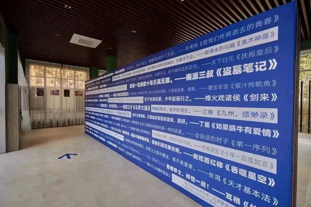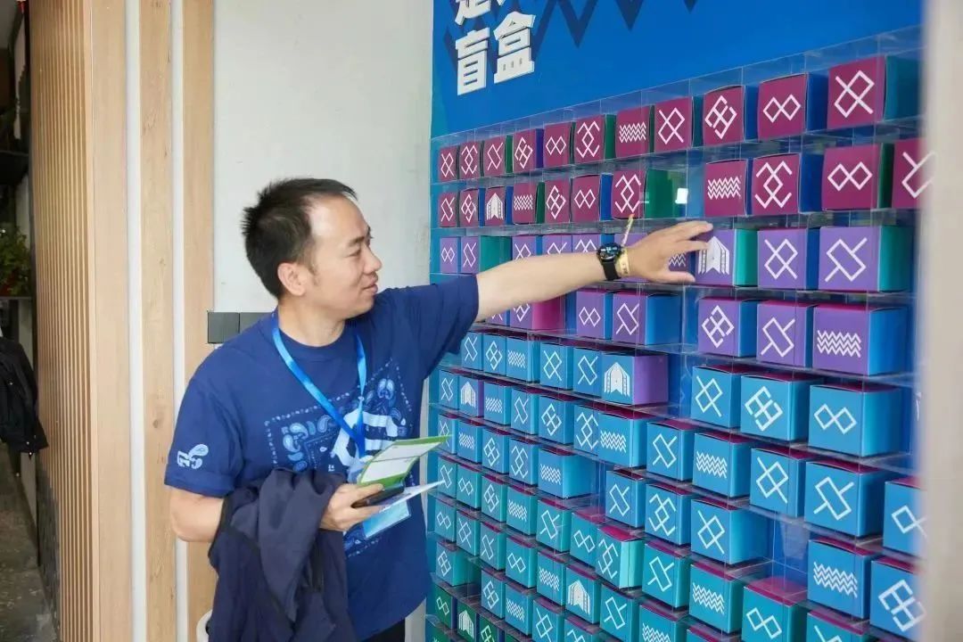 作家驛站的入口,有一整面墻都是文學(xué)盲盒,不同色系的盲盒上印有畬族傳統(tǒng)彩帶中的織紋圖案,有的代表“天長(zhǎng)地久”“溝通”,有的代表“田野”“魚”“民族繁榮”等。參與者完成探營(yíng)日任務(wù)可從中抽取禮物,有網(wǎng)絡(luò)文學(xué)名家簽名實(shí)體書以及畬鄉(xiāng)網(wǎng)絡(luò)文學(xué)村自己設(shè)計(jì)的帆布袋、胸針、書簽、手機(jī)支架等文創(chuàng)周邊產(chǎn)品。作家活動(dòng)照片墻和幾個(gè)放滿網(wǎng)絡(luò)文學(xué)實(shí)體書的書架旁,有山花隨意點(diǎn)綴,頗具人文意趣,這一靜態(tài)空間讓人感受到一種被邀請(qǐng)了解、感受、交流的互動(dòng)感。