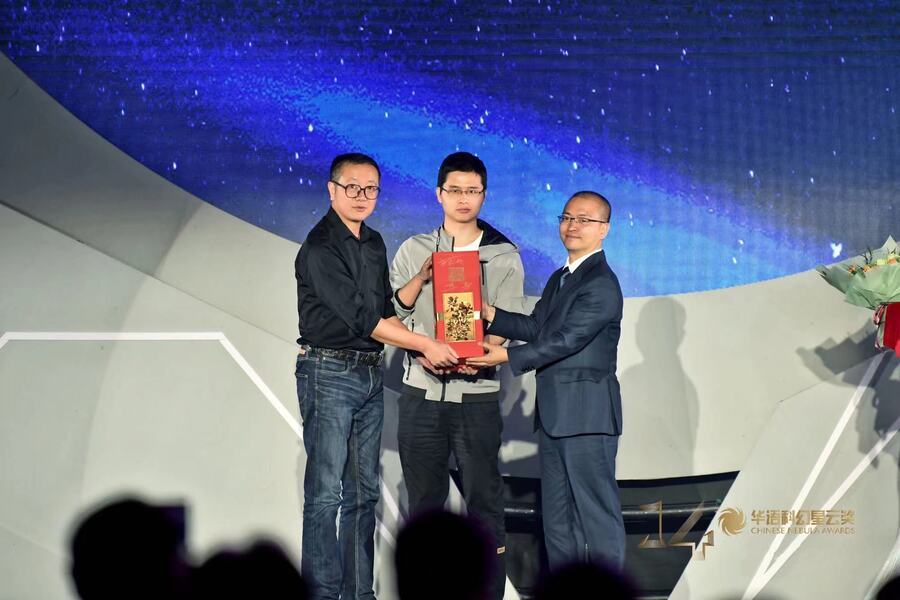 劉慈欣(左一)給“天瑞說符”(中)頒獎