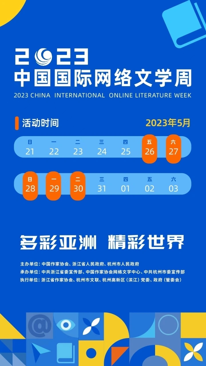 5月27日,由中國(guó)作家協(xié)會(huì)、浙江省人民政府、杭州市人民政府共同主辦的2023中國(guó)國(guó)際網(wǎng)絡(luò)文學(xué)周,即將在浙江杭州開幕。