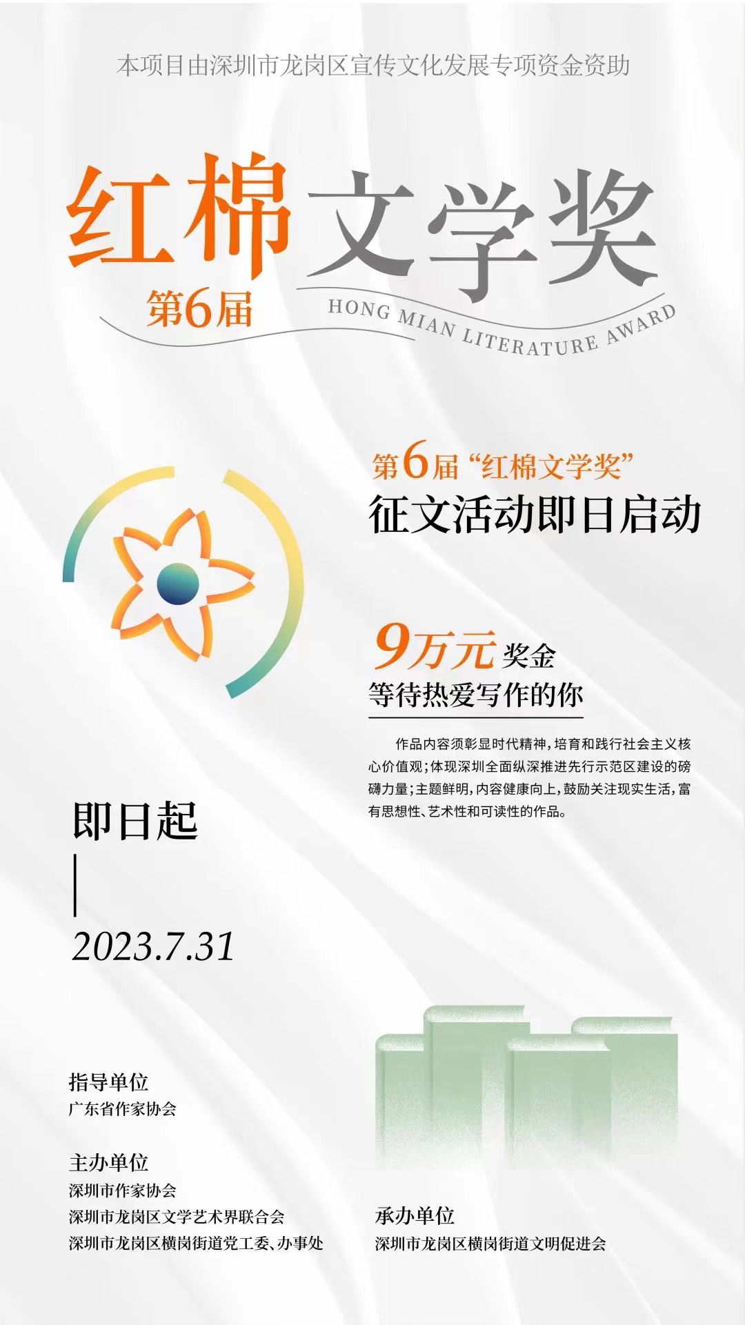 第六屆“紅棉文學獎”是深圳市龍崗區(qū)宣傳文化發(fā)展專項資金資助項目,由廣東省作家協(xié)會指導,深圳市作家協(xié)會、龍崗區(qū)文學藝術界聯合會、中共深圳市龍崗區(qū)橫崗街道工作委員會、深圳市龍崗區(qū)橫崗街道辦事處聯合主辦,真誠歡迎所有漢語寫作者踴躍投稿。
