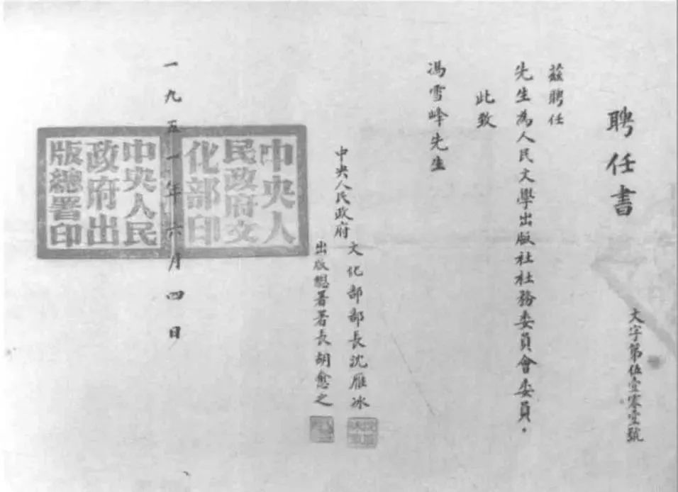 1951年6月4日,馮雪峰被中央人民政府文化部、出版總署聘任為人民文學出版社社務委員的聘任書