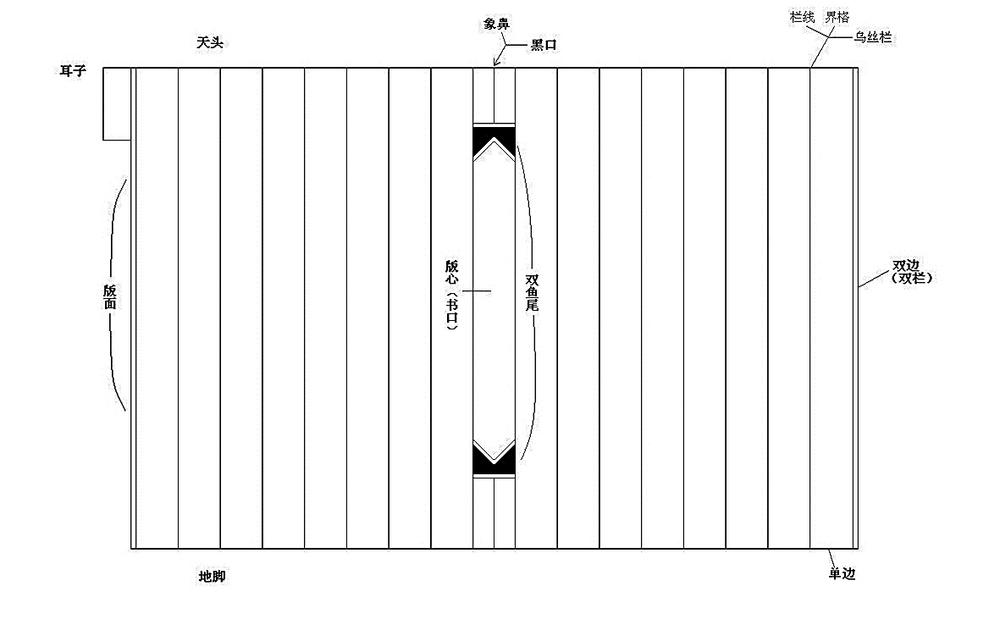 翻開古籍之后,隨之展現(xiàn)的是版框。書版四周的界限叫欄線,上方叫“上欄”、下方為“下欄”,兩邊為“左右欄”或“雙邊”,單線叫“單欄”或“單邊”,雙線叫“雙欄”或“雙邊”。行格欄線多數(shù)是黑色的,但也有朱色,以醒目區(qū)分。如明代《永樂大典》就是這樣。鑒定版本時,應特別注意行款,即版面的行數(shù)和每行的字數(shù)。行款通常以每半頁計算,稱“每半頁若干行,行若干字”等。不同時期、不同地點,行款往往不同。清代江標著有《宋元行款表》用來考證版本。古籍每一版中間折縫處稱為“版心”或“書口”。書口印有黑線的稱“黑口”,不印的稱“白口”;黑線粗的稱“大黑口”,細的稱“線黑口”或“細黑口”;刻在上欄下的叫上黑口,刻在下欄上的叫下黑口。版心中間往往刻有書名、卷次、葉數(shù)。在版心下方還常刻有書鋪名或刻工名。象鼻指黑口本版心上下的黑線,如同象鼻垂在胸前。版心折縫處還常常刻有各種符號,形似魚的尾巴,故稱“魚尾”;種類也有黑魚尾、白魚尾、線魚尾或花魚尾。