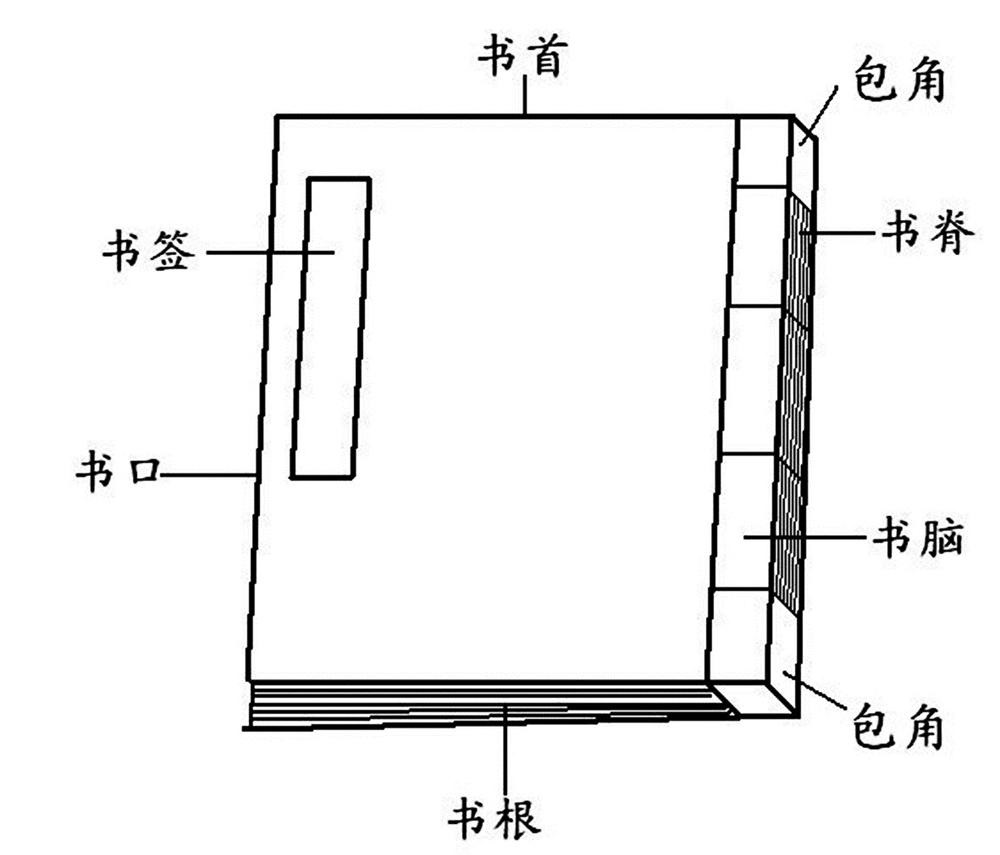 書首、書根、書脊、書口是指書的四周部分。包角是對那些比較珍貴的書,在裝訂時用湖色或者藍色的綾子將書角包起來,起到保護的作用。在江南,許多藏書家往往不用包角,因為容易生蟲。書簽或是紙制的,也有用絲織品的,用來題寫書名。有的書簽會特請名家書寫,顯得美觀典雅。