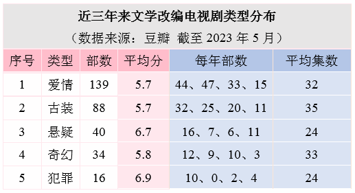 在網(wǎng)絡推薦評分平臺上,共收錄近三年播出的文學改編劇集264部,2020年有90部,2021年有74部,2022年有64部,2023年有36部(截至5月)。其中愛情劇占比最高,達52.7%;其次是古裝劇,達33.3%;再次是懸疑與奇幻,分別占15.2%和12.9%(注:部分作品從屬于多個類型)。就平均制作集數(shù)而言,文學改編作品32集的平均集數(shù)明顯高于國產(chǎn)劇27集的平均集數(shù)。其中,愛情劇平均集數(shù)為32集,與總體持平;懸疑劇平均為24集,體現(xiàn)出短而精的特點;古裝劇較其他類型的平均集數(shù)更長,為35集;再精確到歷史劇,其平均集數(shù)則更長,為53集,以78集的《大秦賦》、70集的《清平樂》和61集的《大宋宮詞》為代表。