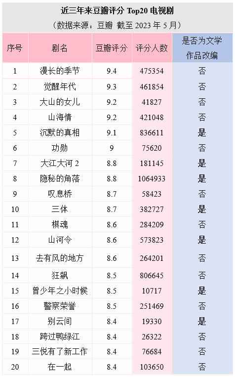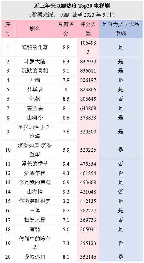 綜合考量豆瓣評分與評分人數(shù),近三年評分前20名的國產(chǎn)劇中,文學改編作品有7部,占比為35%。個別作品可能有改編之實但未公開認定者未計入內(nèi)。2020年,《沉默的真相》《隱秘的角落》《大江大河2》《別云間》四部文學改編作品進入豆瓣評分前10名。21年評分前10名中有1部,為《山河令》。2022年評分前10中,有《人世間》《風吹半夏》《風起隴西》《蒼蘭訣》,共4部。2023年評分前10名中,有4部文學改編作品(截至2023年5月)。 僅僅從豆瓣評分來看,優(yōu)秀的文學改編影視作品,總體影響力尚不能完全與原創(chuàng)影視作品分庭抗禮。
