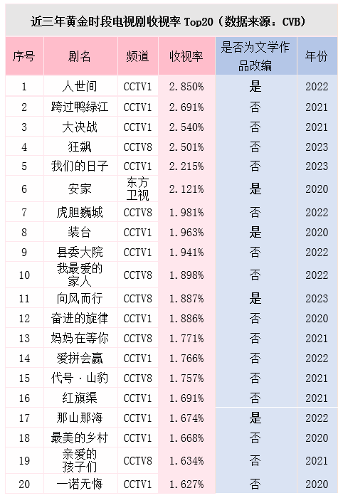 在電視播出方面,由文學作品轉化而來的影視作品,2020年有兩部進入年度收視率前20,2021年為三部,而2022年則增加至六部,其中《人世間》以首播2.85%、重播1.87%的集均收視率一騎絕塵,根據(jù)小說《山哈弄?!犯木幍摹赌巧侥呛!泛透木幾詧蟾嫖膶W《山神》的《高山清渠》也有1.674%和1.399%的收視率。2023年第一季度,四部文學改編作品進入央視黃金時段收官電視劇收視前10,集均收視率均破1,《向風而行》《破曉東方》更是取得了收視率1.89%和1.62%的成績。