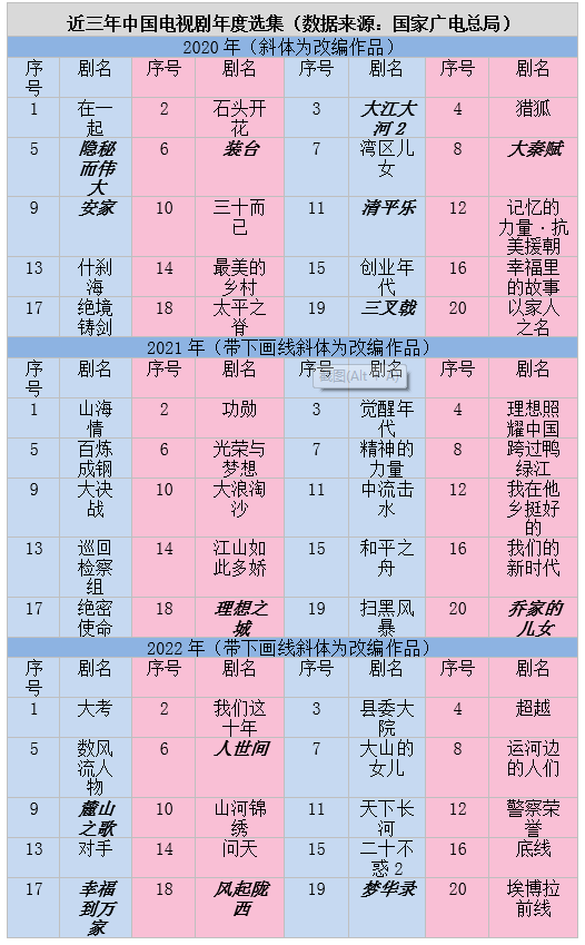 從國家廣電總局公布的近三年“中國電視劇年度選集”目錄來看,60部優(yōu)秀作品中有12部為文學改編作品,占比為20%。其中,2020年有6部文學改編作品入選,為三年來最多(30%);2021年僅有2部(10%),為三年來最少。