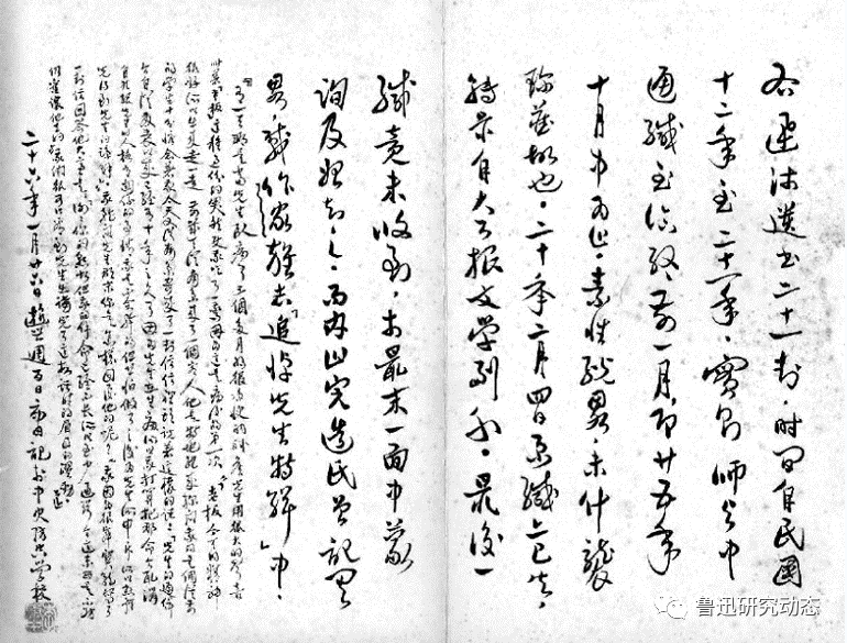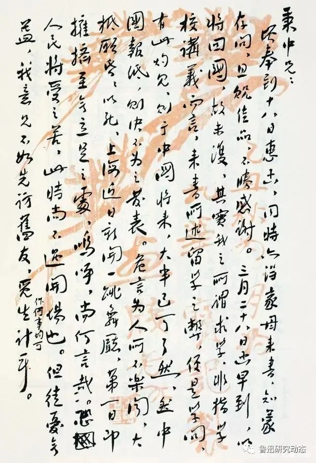 今日閱報(bào),驚悉先生逝世,雖是在辦公室中,不禁伏案慟哭。秉中之得有今日,皆先生之賜。十年來奔走不寧,未能償侍先生講學(xué)之志,誠(chéng)可痛心。然平日對(duì)人處事,一體先生真誠(chéng)態(tài)度,不敢有辱先生,此敢告我先生在天之靈者也。海嬰弟方數(shù)歲,教養(yǎng)之責(zé),全在師母。伏望節(jié)哀,毋損尊體,以肩巨任。回思前日在滬,先生云“病中亦不能停筆休養(yǎng),因停筆不單醫(yī)藥遂停,即飯亦不得吃也”。痛哉此言,秉中返京二十余日來,晨夕耳中皆如聞先生此言,然又束手無策,不能有所奉助。時(shí)時(shí)懷念先生病體,而俗務(wù)累人,竟未能奉書問候,而今竟成終天之憾事。前次先生面允書數(shù)字見賜,病中當(dāng)尚未書就,敢請(qǐng)師母覓先生所書物事賜寄,以存手澤。