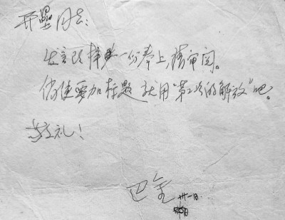 巴金先生的前后發(fā)表的兩篇散文,都附有字?jǐn)?shù)不多的短信,可以說是“便條”,從字跡來看,前者流暢,后者潦草。我注意到巴金在后一封信簽署日期時(shí),把“卅日”改為“卅一日”,猜想那篇散文可能在子夜時(shí)分修改完成的。“巴金日記”記載:“《文匯報(bào)》送來昨天發(fā)言稿的校樣。修改校樣,并起草在政協(xié)學(xué)習(xí)會(huì)上的發(fā)言稿,寫到十點(diǎn)后不到四頁,疲憊不堪?!保?月30日日記)“八點(diǎn)后校改發(fā)言稿,九點(diǎn)后《文匯報(bào)》小武取去校樣,送來讀者信十五封”(6月 1日日記)
