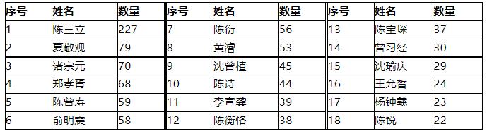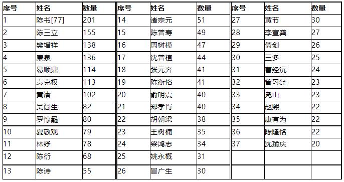 上?!稏|方雜志》1908-1920年間,“文苑”(包括“詩(shī)選”“海內(nèi)詩(shī)錄”)共101期,165位詩(shī)人發(fā)表了1490馀題舊詩(shī),發(fā)表作品(包括極少量的文和詞)超過(guò)20題的詩(shī)人有18位: