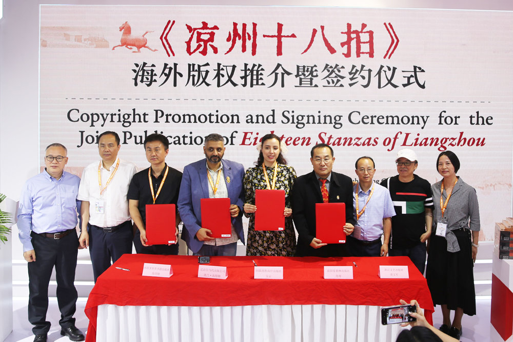 當(dāng)日下午,由浙江出版聯(lián)合集團(tuán)主辦、浙江文藝出版社承辦的“《涼州十八拍》海外版權(quán)推介暨簽約儀式”在第二十九屆圖博會(huì)現(xiàn)場(chǎng)舉行。簽約儀式上,作家葉舟和浙江文藝出版社跟西班牙世界書籍出版社、羅納尼亞集成出版社、阿聯(lián)酋指南針出版社、泰國(guó)曼德琳出版集團(tuán)和尼泊爾當(dāng)代出版公司簽訂《涼州十八拍》的西班牙語(yǔ)、羅馬尼亞語(yǔ)、阿拉伯語(yǔ)、泰語(yǔ)、尼泊爾語(yǔ)等語(yǔ)種的翻譯出版合作協(xié)議。這也成為本屆圖博會(huì)上中國(guó)文學(xué)走出去的標(biāo)志性成果之一。
