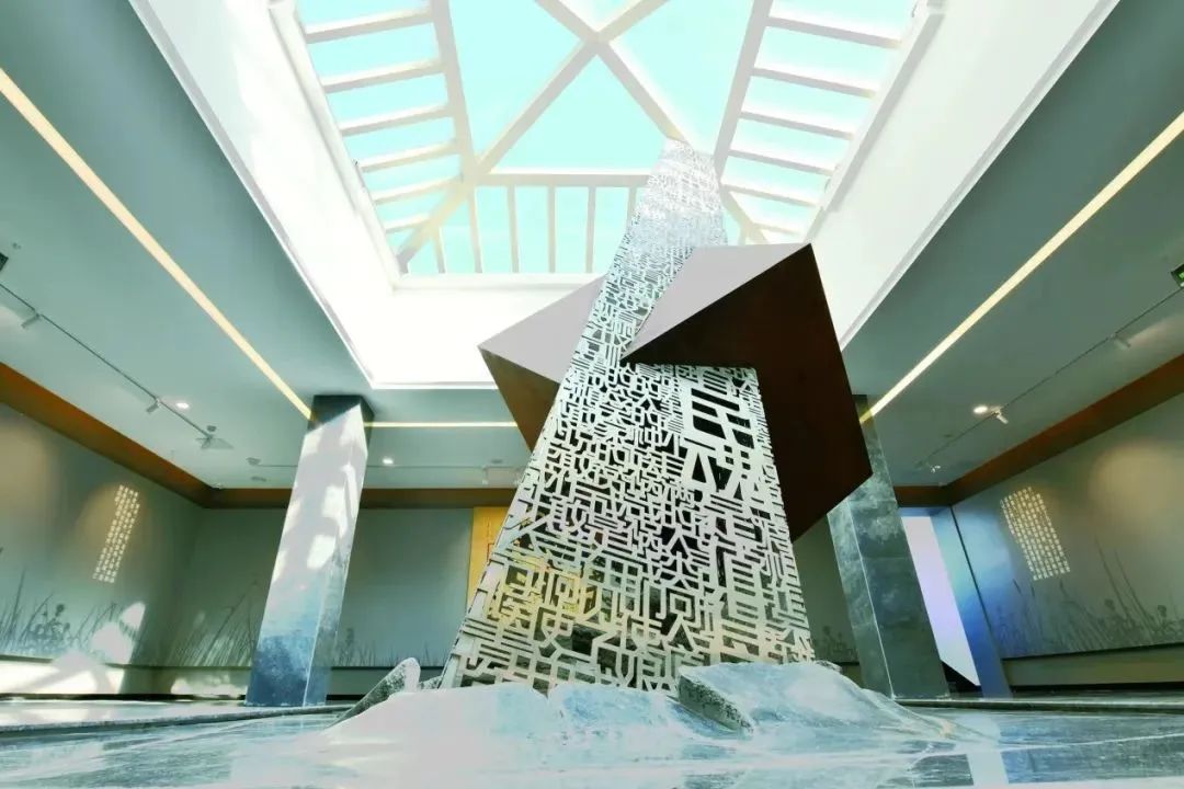 展覽序廳的中央設(shè)置的藝術(shù)雕塑,是一個(gè)幾何造型金屬鏤空的三角形裝置,由魯迅著作篇名和名言警句鑲嵌連綴而成,下大上小,拔地而起。金屬字的棱角表現(xiàn)魯迅文字的犀利。這可以是一座語(yǔ)言的巴別塔,也可以象征文學(xué)家的如椽巨筆。在鋼柱的中段,有一個(gè)緊箍鋼柱但卻正被沖破的鐵銹正方體,讓人聯(lián)想到《〈吶喊〉自序》中魯迅與錢(qián)玄同那場(chǎng)著名的“鐵屋對(duì)”。用了三角形,是因?yàn)轸斞冈f(shuō)過(guò):“生命的路是進(jìn)步的,總是沿著無(wú)限的精神三角形的斜面向上走,什么都阻止他不得。”當(dāng)然,雕塑的象征意義可以有多重解釋,觀眾可以在這里沉思回想,體會(huì)魯迅精神世界的豐富性和復(fù)雜性。
