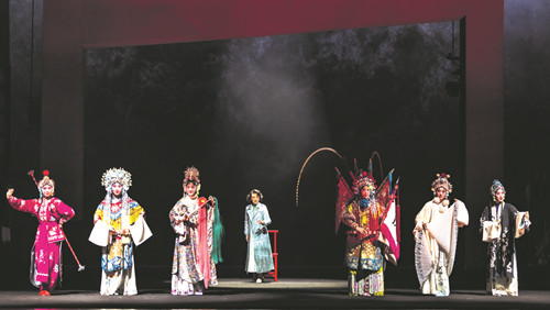 舞臺表現(xiàn)方面,劇中主人公憶秦娥自如地出入敘事和抒情,同時將傳統(tǒng)京劇人物外化為“戲魂”,巧妙地融入憶秦娥的內(nèi)心視象。音樂設計突出民族器樂的獨奏特點,笙、簫、笛、二胡、京胡、高胡、琵琶等發(fā)揮了“四兩千斤”“以一當十”的能量。此外,聲聲板鼓貫穿全劇始終,既是胡三元的職業(yè)縮影,又是引領、伴隨、激勵憶秦娥成長的動力。舞美設計根據(jù)京劇虛擬性特征設計的懸掛式可轉(zhuǎn)動框架,既標志著舞臺臺口,亦是時間流逝和時代變遷的外化,象征人生舞臺亙古不變、周而復始。