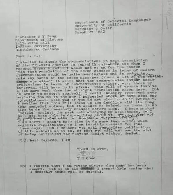 多年前,我曾閱讀過(guò)趙元任自己撰寫的《早年自傳》和他人撰寫的相關(guān)傳記。2018年10月,在筆者應(yīng)邀赴斯坦福大學(xué)作學(xué)術(shù)講座期間,順訪了伯克利大學(xué)東亞圖書館。經(jīng)過(guò)周欣平館長(zhǎng)批準(zhǔn),東亞圖書館特別提供了趙元任與外祖父鄧嗣禹的九封往來(lái)信札,時(shí)間從1941年到1962年。其中包括在1942—1944年期間,兩人分別在哈佛大學(xué)、芝加哥大學(xué)主持美軍特訓(xùn)班的學(xué)術(shù)交流信息。這些珍貴的信札不僅反映了兩人學(xué)術(shù)交往的諸多信息,而且可以彌補(bǔ)現(xiàn)已出版的《趙元任全集》和《趙元任年譜》中的不足之處。通過(guò)閱讀這些珍貴的一手資料,筆者對(duì)趙元任先生有了更深刻的了解。
