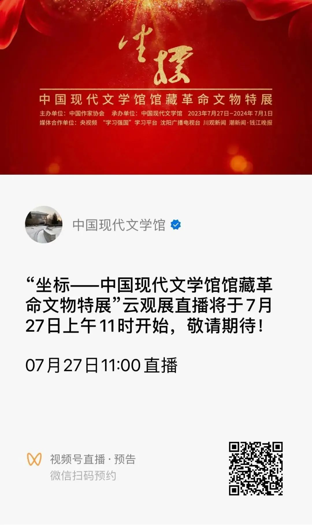 中國現(xiàn)代文學館與央視頻《品讀》聯(lián)合舉辦的探展直播將于7月27日上午11時正式開始,歡迎您觀注中國現(xiàn)代文學館微信視頻號、官方抖音號、官方快手號,收看直播。
