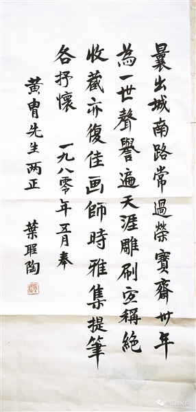“雕刷宐稱絕”的“宐”通“宜”,《說(shuō)文》“所安也。從宀之下,一之上”。榮寶齋19世紀(jì)末設(shè)立“帖套作”機(jī)構(gòu),為后來(lái)木版水印事業(yè)的發(fā)展奠定了基礎(chǔ),自然是“雕刷宐稱絕”的了。當(dāng)年的榮寶齋經(jīng)常舉辦書畫家們聚會(huì)雅集的活動(dòng),所謂“畫師時(shí)雅集 提筆各抒懷”,這幅圣老題黃胄大師的條幅,應(yīng)該就是在雅集上相互題贈(zèng)的抒懷雅物。