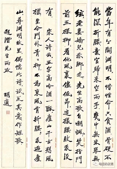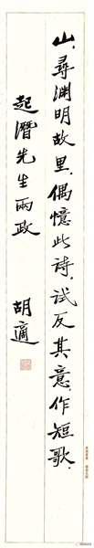 胡適有詩(shī)《陶淵明與他的五柳》書法贈(zèng)顧廷龍(字起潛),最后落款即“起潛先生兩政”?!皟烧保ā罢蓖ā罢保沧鳌皟烧保?,表示請(qǐng)對(duì)方對(duì)自己寫的詩(shī)文、書法兩個(gè)方面都給以指正。如果書法是抄寫他人作品,當(dāng)然就不能做“兩政”或“兩正”。