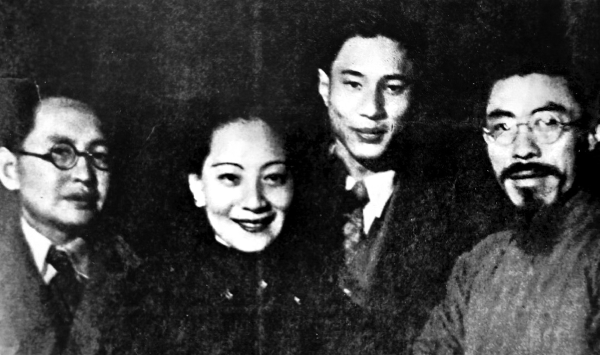 話劇《祖國(guó)》主創(chuàng)人員。右起聞一多、孫毓棠、鳳子、陳銓(1939年,昆明)