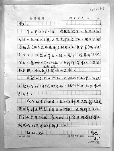 可誰(shuí)能料到,上述兩信竟是骨折手術(shù)后出院不久的85歲老人寫于病榻之上?!拔以诖采?,靠在靠墊上寫信,很不好寫。希望您原諒我的潦草。”遙想老人忍著傷痛寫信的情景,讀到信尾的附言:“一切從今年開始,必須樂觀有信心!您見到苗子夫人時(shí),她剛開過(guò)一次刀,不久又開了一次,最近又一次,(乳腺癌兩次,子宮癌一次)人家也不在乎?!保?004年2月23日信)心中充滿感傷與感佩。