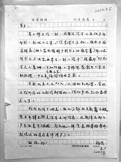 可誰能料到,上述兩信竟是骨折手術(shù)后出院不久的85歲老人寫于病榻之上?!拔以诖采?,靠在靠墊上寫信,很不好寫。希望您原諒我的潦草?!边b想老人忍著傷痛寫信的情景,讀到信尾的附言:“一切從今年開始,必須樂觀有信心!您見到苗子夫人時(shí),她剛開過一次刀,不久又開了一次,最近又一次,(乳腺癌兩次,子宮癌一次)人家也不在乎?!保?004年2月23日信)心中充滿感傷與感佩。
