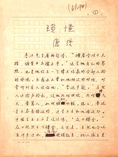 我在中學(xué)時(shí)就曾學(xué)過《瑣憶》這篇文章,時(shí)隔多年,再次邂逅《瑣憶》,卻是在中國現(xiàn)代文學(xué)館館藏珍品中看到唐弢的手書原稿。伴隨著少年時(shí)的記憶,我再次重讀了收錄在高中課本上的經(jīng)典文章。雖然手稿上布滿修改和圈涂的痕跡,細(xì)細(xì)辨認(rèn),慢慢讀來,卻也有一番久別重逢的親切感。那隨處可見的涂抹圈畫和比比皆是的修改筆跡,讓我在感受到作者字斟句酌、精益求精的嚴(yán)謹(jǐn)之余,倒是比少年時(shí)更讀懂了作者的良苦用心和他對(duì)魯迅先生的深切懷念之情。