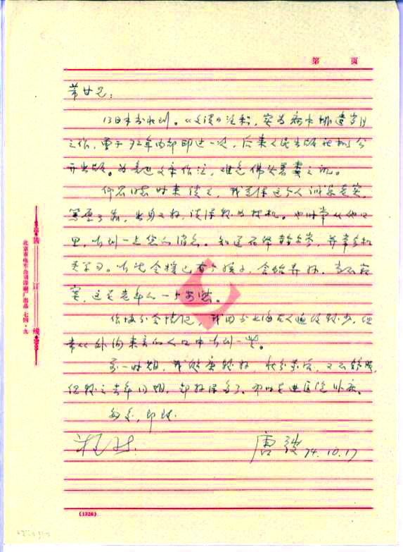 1974年10月17日唐弢給巴金寫了一封書信,這封信珍藏在中國現(xiàn)代文學館的書信庫中。書信篇幅不長,內(nèi)容豐富,字里行間透著唐弢和巴金之間的真摯友情以及對彼此的牽掛,真摯的話語讓人感動又親切。