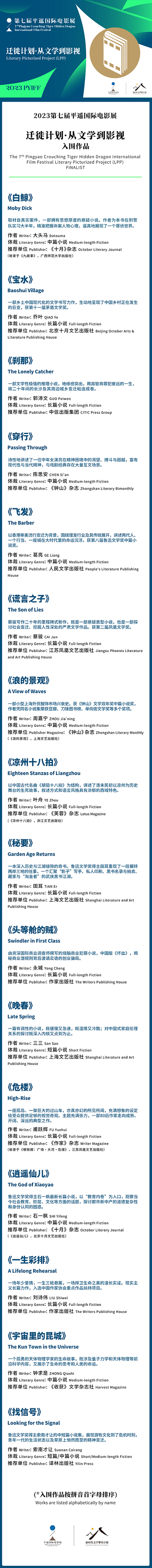 9月7日,第七屆平遙國際電影展產(chǎn)業(yè)板塊“遷徙計(jì)劃·從文學(xué)到影視”單元入圍作品揭曉,由葛亮、田耳、石一楓、喬葉、索南才讓、三三、劉詩偉、周嘉寧、鐘求是、陳思安、甫躍輝等作家創(chuàng)作的16部文學(xué)作品最終入圍。