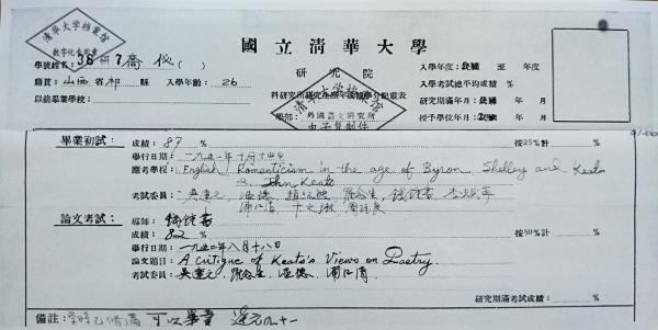 喬佖先生清華研究生畢業(yè)的成績(jī)學(xué)分記載表