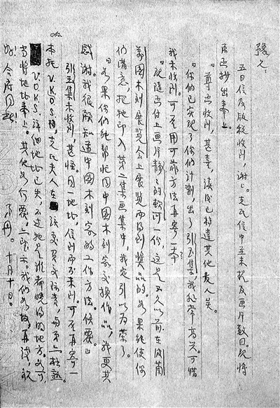 盡管如此,魯迅依舊是展陳的靈魂人物,是不在場(chǎng)的在場(chǎng)者。魯迅是上世紀(jì)新興木刻版畫(huà)運(yùn)動(dòng)的第一推手,時(shí)間最早的幾件展品中便有1934年10月曹靖華寫(xiě)給他討論中蘇木刻交流的手書(shū)。而最晚的幾件展品中,1983年9月美術(shù)家彥涵寫(xiě)給張望的信里談及內(nèi)山嘉吉即將訪(fǎng)華——內(nèi)山嘉吉是魯迅摯友、內(nèi)山書(shū)店老板內(nèi)山完造的胞弟,1931年受魯迅邀請(qǐng)到上?!澳究虃髁?xí)會(huì)”主講木刻藝術(shù),翻譯就是魯迅本人。