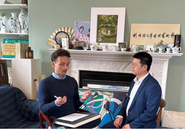 在英國第二站,橫掃天涯來到英國劍橋大學(xué),參觀了三一學(xué)院、國王學(xué)院等知名學(xué)院,參訪了華茲華斯、拜倫、徐志摩等文學(xué)名家留下的足跡,到康河出版社(Cam Rivers Publishing)與讀者見面,并與畢業(yè)于劍橋大學(xué)人類、社會和政治科學(xué)專業(yè)的出版社資深編輯拉文特·克洛斯先生進(jìn)行文學(xué)對話,分享了他的創(chuàng)作歷程和近期在英國等歐洲國家開展國際文學(xué)交流的體會,并就網(wǎng)絡(luò)文學(xué)在國內(nèi)外的發(fā)展,以及未來的走向進(jìn)行了深度探討。